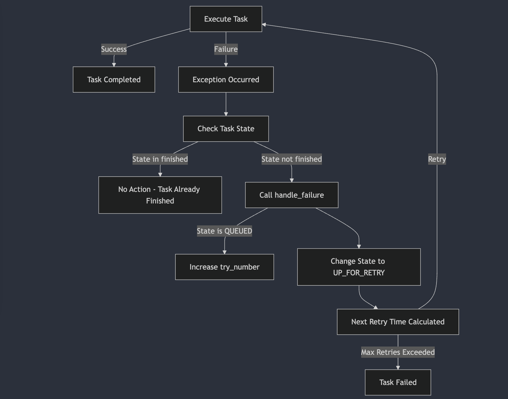 UP_FOR_RETRY 상태인 task는 앞서 언급된 지수적 백오프(exponential backoff) 알고리즘을 적용하여 계산된 다음 재시도 시간이 만족된 경우에 수행되게 된다.