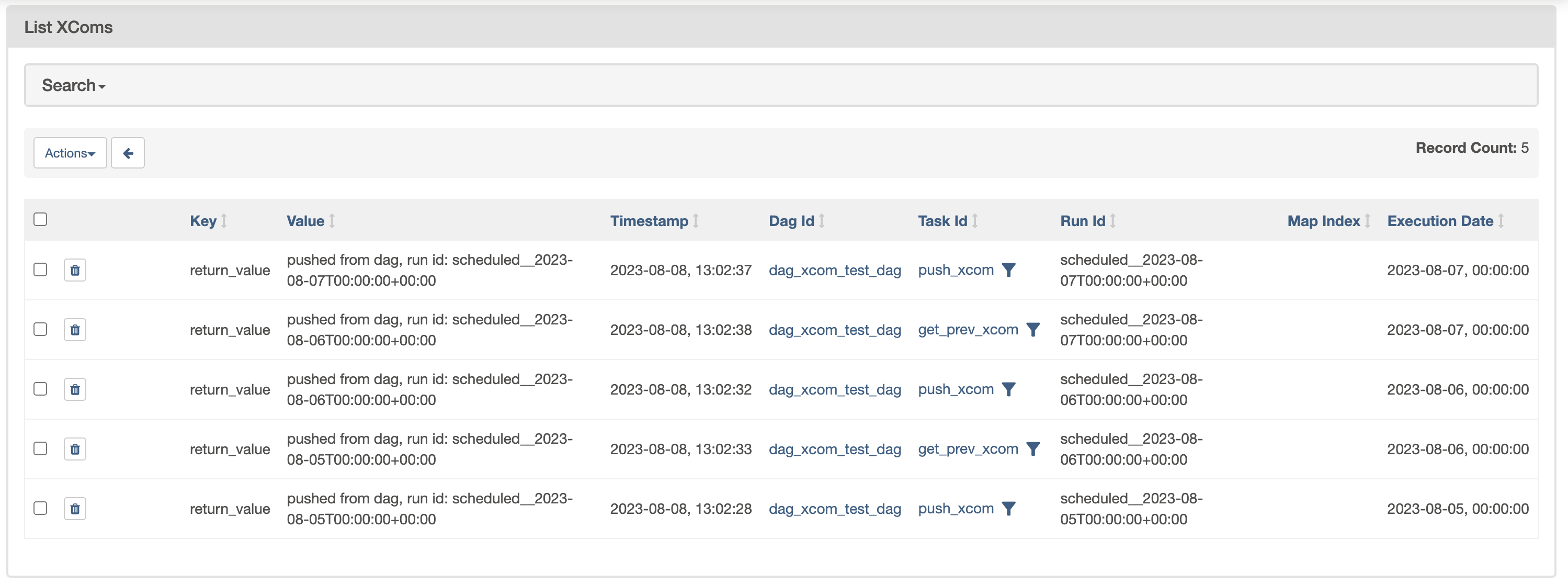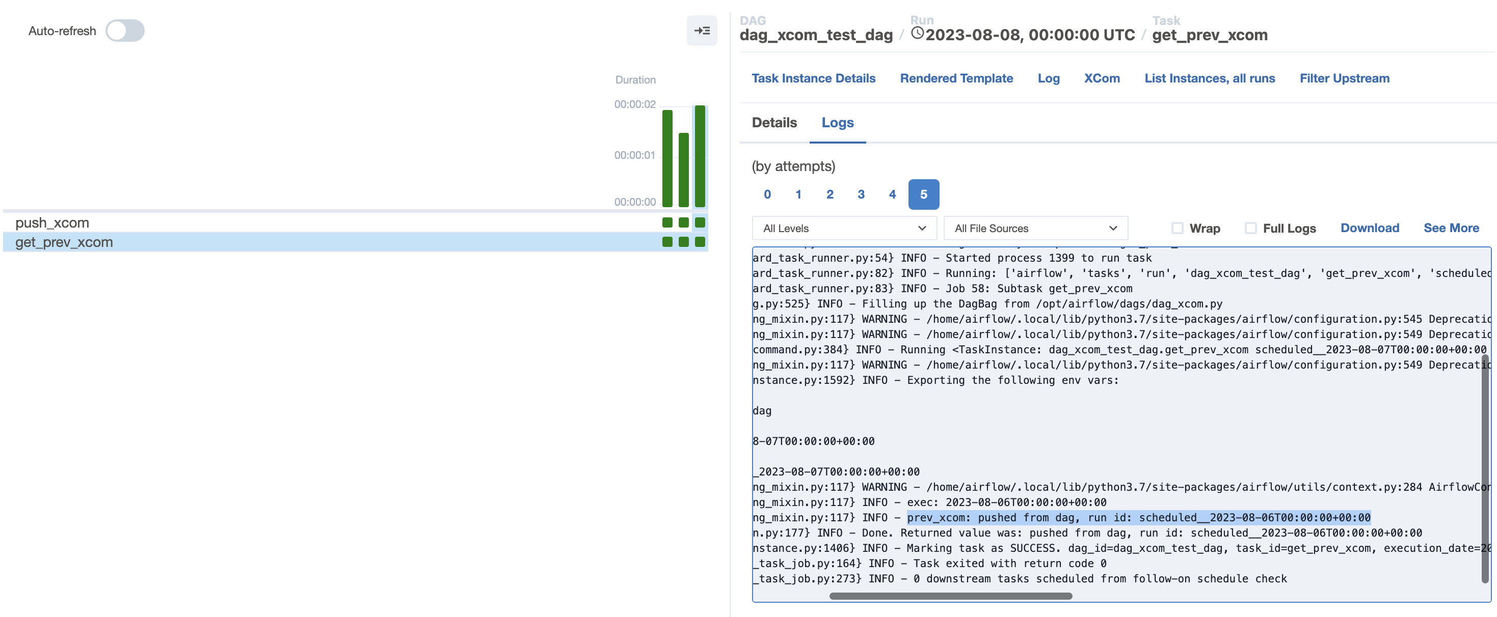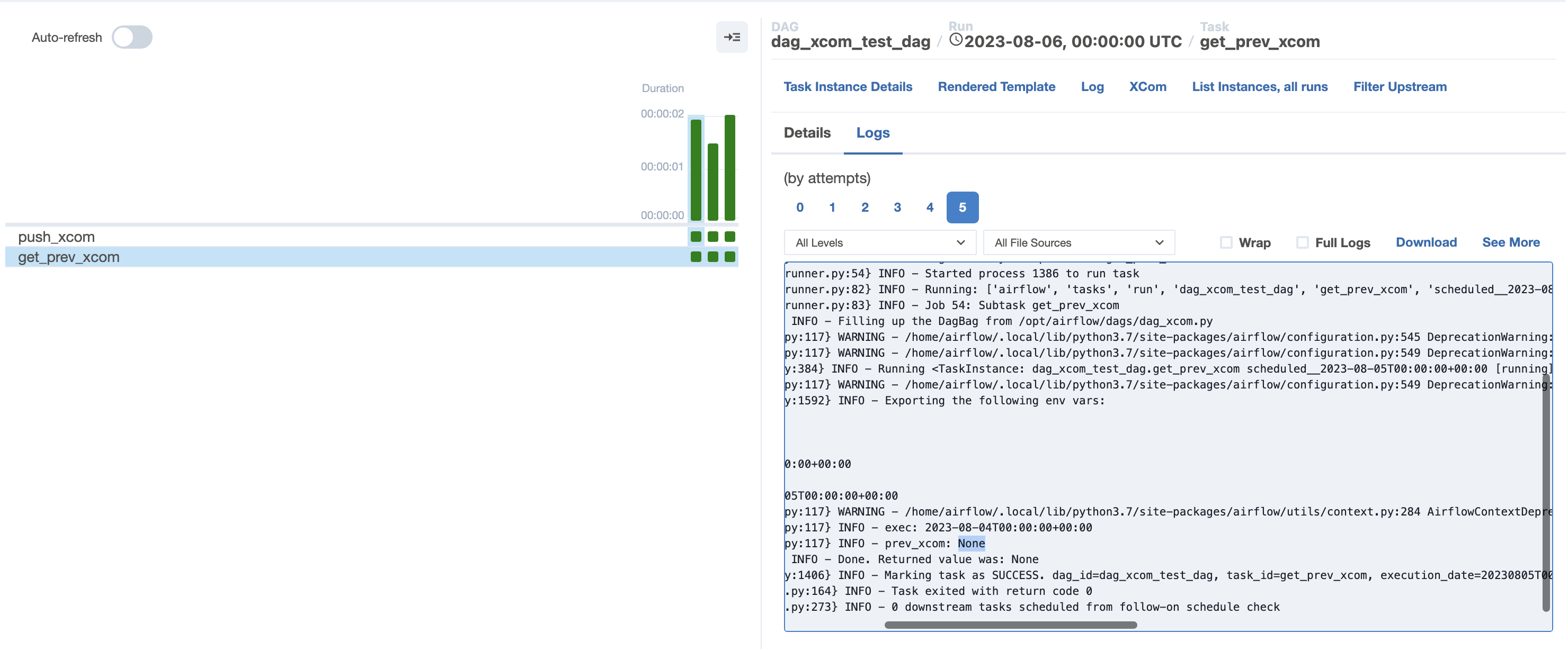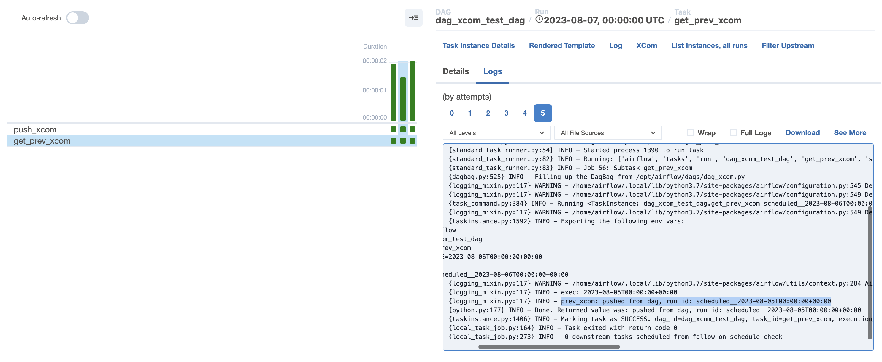 처음 run에 대해서는 이전에 dag가 실행된 적이 없으므로 가져오는 xcom은 없고 pushed from dag, run id: scheduled__2023-08-05T00:00:00+00:00